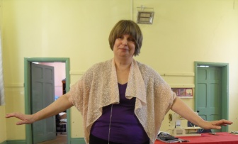 whilst I am a [slightly reluctant] model for Doris’ shrug which she knitted at Dream Week [Metropolitan] with Ann Brown.