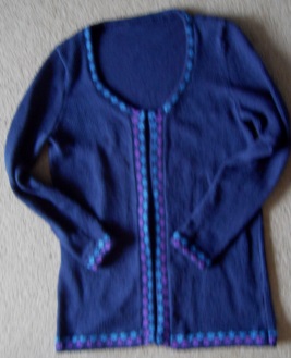 A simple edge-to-edge cardigan knitted with a Fair Isle border in Yeoman Panama