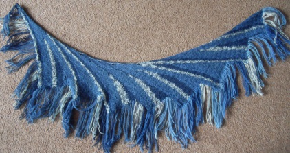 The Owl pattern was shown again, with its slip stitch patter suited to colour changing, as well as a revised version of the Asymmetrical Scarf, re-badged as a Sock Wool Scarf, with a fringe knitted on the knitting machine, and an option to make it longer [it will still take less than 100gm].