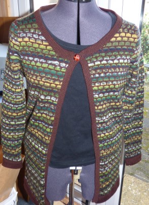 A long line, open front cardigan in multicolour tuck stitch. Standard gauge, 7 sizes.