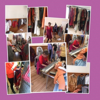 Anne brought a fantastic collection of garments and patterns in her unique style, and inspired us all with her approach to machine knitting. She described how she was familiar with it from a very early age, through her mother’s machine knitting, and how she overcame her initial distance from machine knitting to develop her own style. Then we were treated to a detailed look at various garments and their construction, a video of Anne and her friends and customers at Ascot races [wearing a stunning variety of her designs], and finally a demonstration of how to incorporate a raglan sleeve in a one piece sideways knitted top.