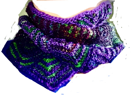 A patchwork knitted neck warmer, using mitred squares – pattern available by clicking on picture